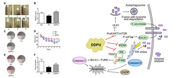 研究人员首次发现给予DDPU的AD模型小鼠出现了明显的脑内蛋白沉淀斑减少以及神经细胞凋亡减少,并且小鼠记忆损伤以及认知障碍得到明显恢复。机制研究结果显示,DDPU通过抑制PERK/eIF2a通路以减少BACE1的翻译从而抑制Aβ的生成,此外,DDPU调节PI3K/AKT/mTOR通路以增强自噬作用,从而加强Aβ的清除。通过“一石二鸟”策略逆转了脑内Aβ蓄积-既能抑制Aβ的生成,又能增加Aβ的清除。更重要得是,DDPU一方面能够通过减少A
