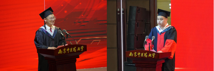 2017级临床医学专业陈俊燃同学、2019级中西医结合基础专业博士生唐校柱同学代表全体毕业生发表了感言。他们回顾了入校以来的点点滴滴,表达了对母校和老师们的感恩之情,并表示将心怀南中医人的底气,肩负起时代赋予的使命,在青春的赛道上奋力跑出南中医青年的最好成绩。