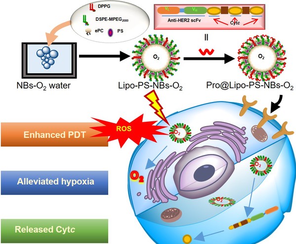 课题组还结合前期开发的具有自主知识产权的融合蛋白药物:人表皮生长因子受体2单链抗体-细胞色素c(anti-HER2 scFv-ncytc)(ZL111944056;J. Cell. Mol. Med. 2021, 25, 10638.),设计了anti-HER2 scFv-ncytc修饰的载氧纳米气泡(Pro@ Lipo-NBs-O2),并以肽菁类光敏剂(PS)作为光动力模型药物,获得了O2、PS、anti-HER2 scFv-ncytc三要素联合递送的载体Pro@ Lipo-PS-NBs-O2,发展了纳米气泡中氧增强光动力疗法的新药物传递模式。