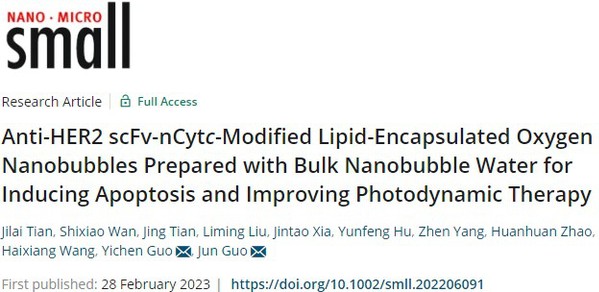 2023年2月,sunbet申搏∙整合医学公司郭军教授团队在国际知名学术期刊Small(中科院材料科学一区, IF=15.153)公开发表了基于氧纳米气泡、细胞色素c融合蛋白与光动力联合治疗乳腺癌的最新研究成果(图1),论文题目为“Anti-HER2 scFv-nCytc-Modified Lipid-Encapsulated Oxygen Nanobubbles Prepared with Bulk Nanobubble Water for Inducing Apoptosis and Improving Photodynamic Therapy”。(原文链接:https://pubmed.ncbi.nlm.nih.gov/36855335/)。