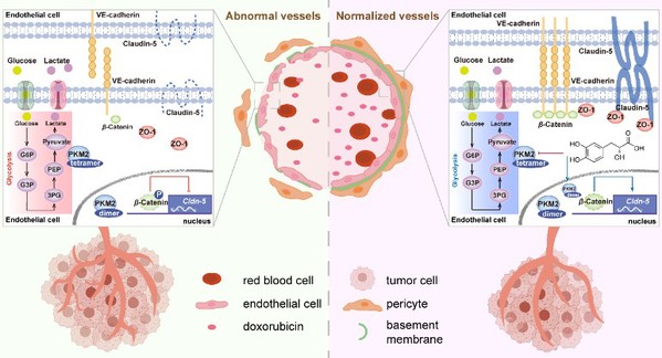 鉴于肿瘤血管结构和功能异常阻碍化疗药物在瘤内递送的临床问题,迫切需要发现促肿瘤血管正常化药物。该研究发现丹参活性成分丹参素通过调控PKM2抑制内皮细胞糖代谢,通过β-Catenin/Claudin-5轴增强内皮细胞紧密连接,促进化疗药物瘤内分布。此研究揭示丹参素可作为肿瘤血管正常化有效药物并为肿瘤联合治疗提供潜在选择。原文链接:https://doi.org/10.1016/j.apsb.2024.02.003