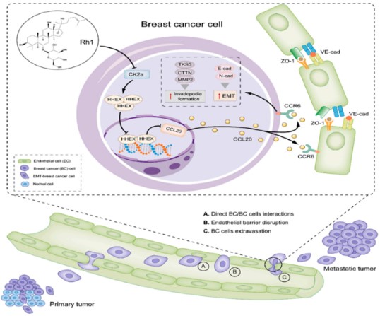 肿瘤转移是临床癌症患者死亡的重要原因,肿瘤细胞外渗伴随着肿瘤与内皮细胞间相互作用。因此,靶向肿瘤细胞与内皮细胞间串扰是抑制肿瘤转移的重要策略。此研究发现人参皂苷Rh1,作为一种新型CK2α抑制剂,通过与 CK2α结合促进HHEX核易位,逆转CCL20-CCR6信号介导的肿瘤细胞侵袭性增加。此研究为中医临床运用中药人参抗肿瘤提供依据。https://doi.org/10.1016/j.phrs.2023.106986