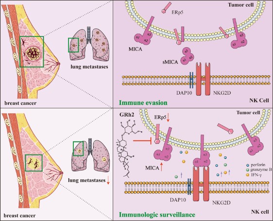 中医临床常用补气药人参治疗肿瘤,然而潜在作用机制尚不明确。该工作发现人参皂苷Rh2可抑制ERp5表达干扰脱落sMICA形成,激活NK细胞杀伤功能,减少乳腺癌增殖和肺部转移。此研究发现人参皂苷Rh2抗乳腺癌转移作用机制并为优化乳腺癌治疗提供了潜在选择。原文链接:https://www.sciencedirect.com/science/article/pii/S0944711323005391
