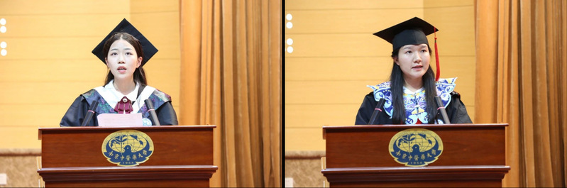 2019级临床医学专业王纤易同学、2021级中西医结合基础专业博士研究生柯梦颖同学代表全体毕业生发表感言。他们分享了入校以来的所思所悟、所学所得,表达了对母校和老师的感恩之情,并表示将肩负起杏林学子的使命与担当,将青春理想融入继承发展中医药的火热实践中,以更加坚定的信念和扎实的知识书写为中国式现代化挺膺担当的青春华章。