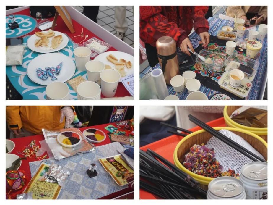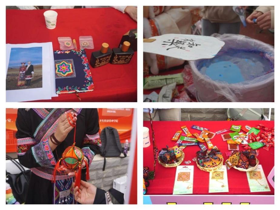 哈萨克族酸奶疙瘩、蒙古族鲜奶豆腐、布依族荷叶粑、回族八宝茶等美食香气四溢,吸引众多师生纷纷品尝。汉族漆扇、苗族扎染、布依族蜡染手提包、瑶族耳饰、黎族织锦和竹编等特色手工艺品,以其独特的民族风情、精湛的手工技艺和丰富的文化内涵,让师生们驻足观赏,赞叹不已。从生动的民族舞蹈到悠扬的民族音乐,精美的民族服饰到独特的民族美食和手工艺品,每一个环节都充满了浓郁的民族文化特色。